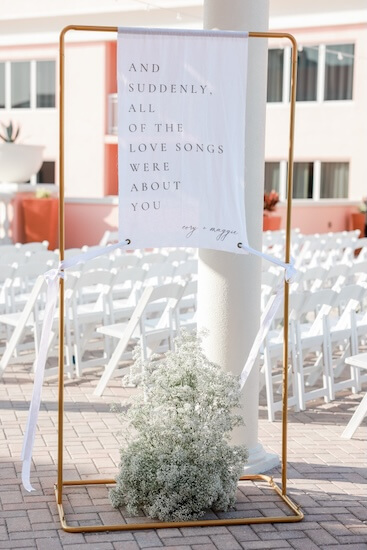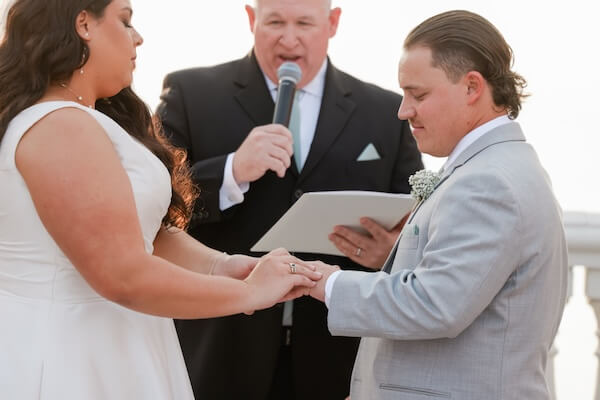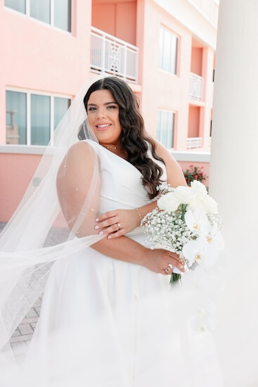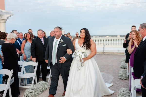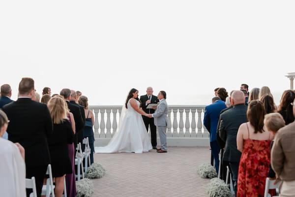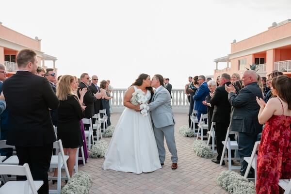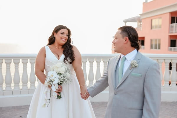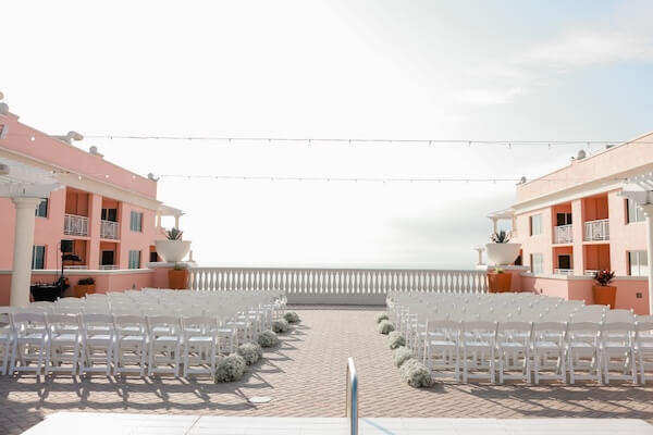 On the hotel’s Sky Terrace, overlooking Clearwater Beach and the Gulf of Mexico, everything was in place for a beautiful wedding ceremony. White garden chairs created an aisle, framed with billowing baby’s breath.