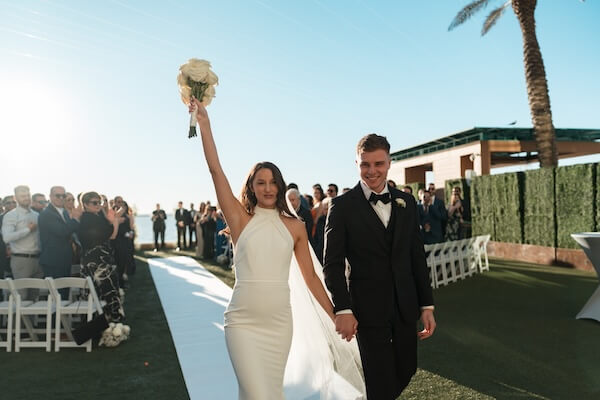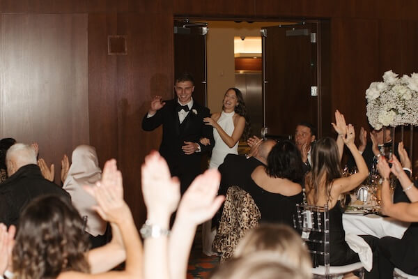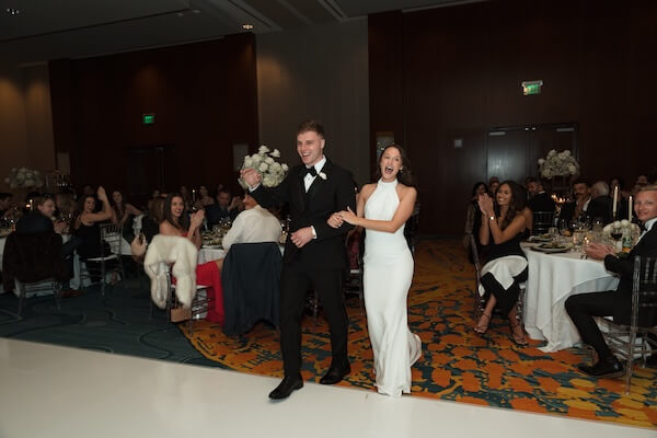Making their grand entrance, the newlyweds made their way to the dance floor for their first dance to “Wonderwall,” by Oasis.