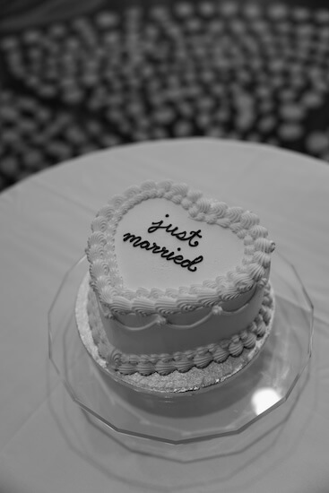 This unique, heart-shaped, single-tier wedding cake, featuring “Just Married” on top, was a fun detail.