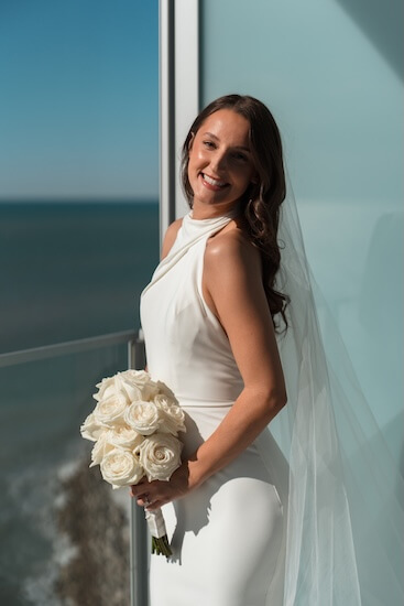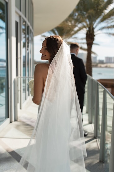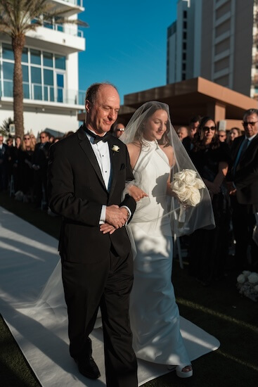 The ceremony lawn, overlooking Clearwater Beach and the Gulf of Mexico, was set with white garden chairs. A fifty-foot-long white runner lined the walkway, decorated with floral arrangements. It led to a freeform white floral wedding structure.