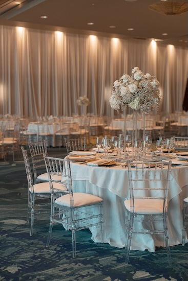 Inside the resort’s ballroom, the space was draped in white fabric. Tables were covered with white linens and surrounded by clear acrylic chairs. The table tops were decorated with white roses, baby’s breath, and flickering candles. Gold charger plates, candlesticks, and accessories added a splash of color.