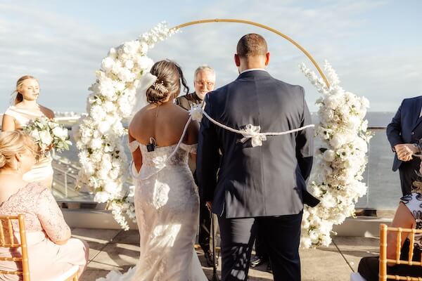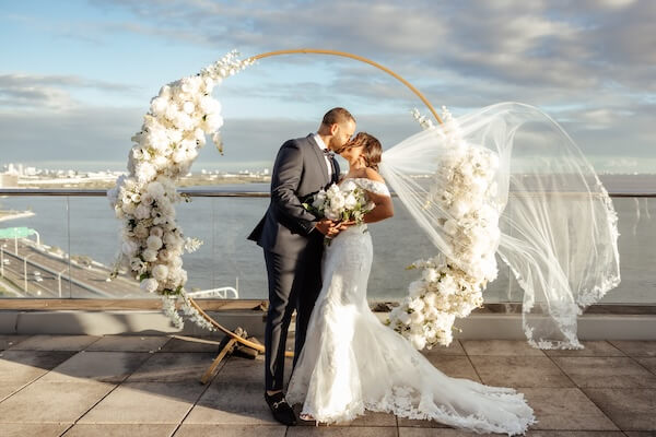 The rooftop was a beautiful location for the couple’s wedding ceremony. Gold chivari chairs and gold moon gate decorated with lush white flowers created a magical space for the wedding ceremony.