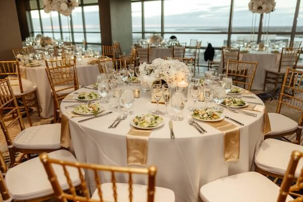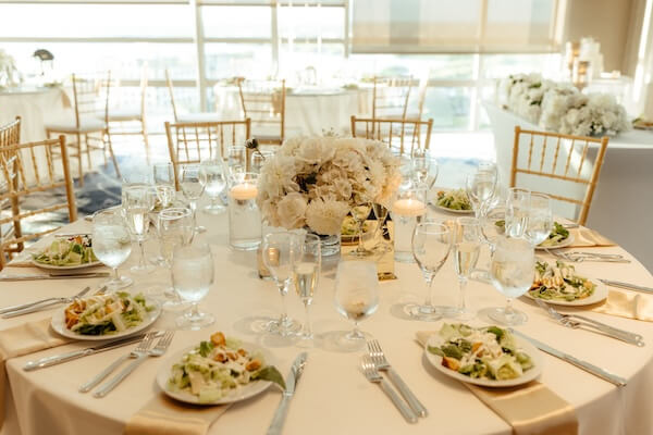The hotel’s ballroom tables were draped with crisp white linens and surrounded by gold chivari chairs. Champagne-colored napkins in a waterfall fold held guests’ salads, and gold table numbers and white floral arrangements completed the tablescape.