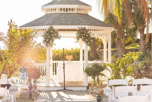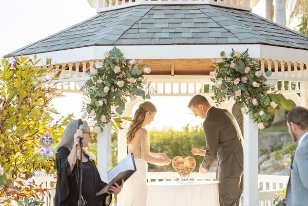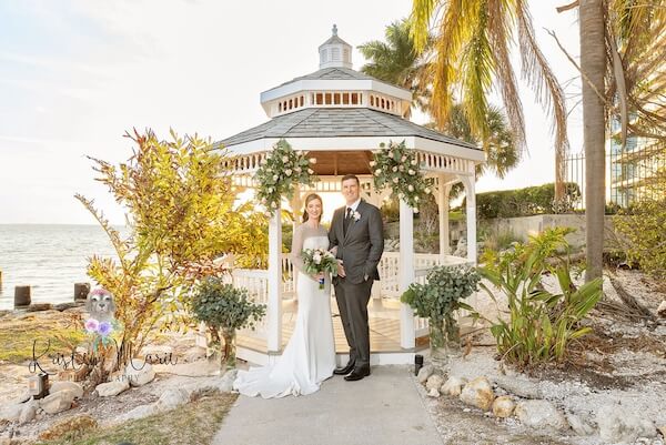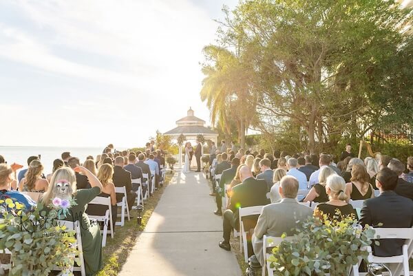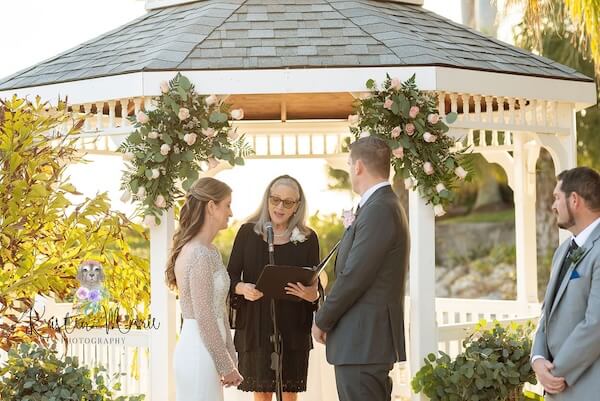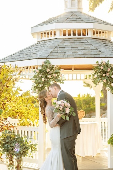 The wedding gazebo along Tampa Bay was decorated with beautiful flowers and greenery and accented with silver lanterns. Harp music was a sweet and beautiful choice for the ceremony.