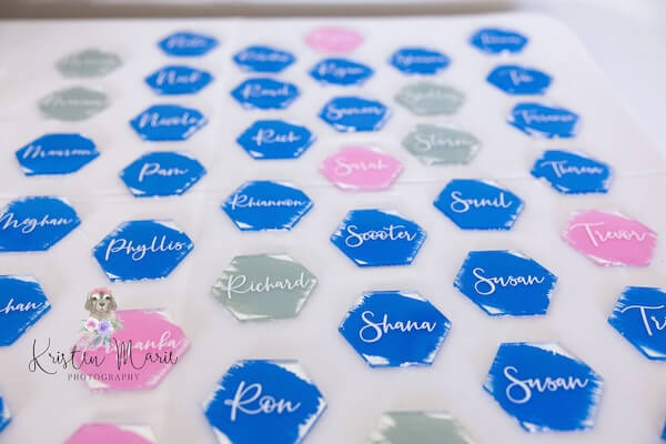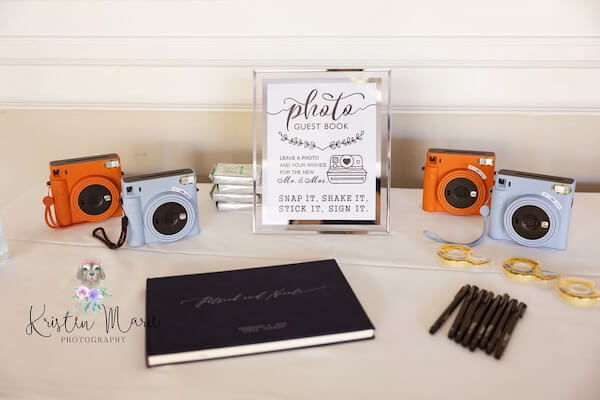 Cocktail hour allowed guests to pick up their escort cards. These custom, colorful coasters identified the guests’ entree selection of Beef, Chicken, or Vegetarian. And guests got to add their wishes and Polaroid photos to the couple’s guest book.
