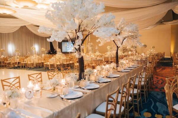 The ballroom of the Opal Sands Resort was nothing short of magical. The room was filled with flowering trees, flickering candlelight, floral arrangements, and incredible details. The white, ivory, and gold color story made the room look like you stepped into a fairytale.