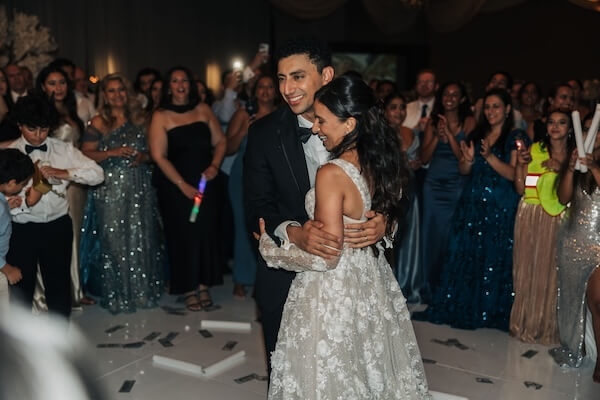 AS things quieted down, the newlyweds took their seats at the sweetheart table. They then welcomed family and friends. Simon shared a blessing, and then it was time for their first dance.