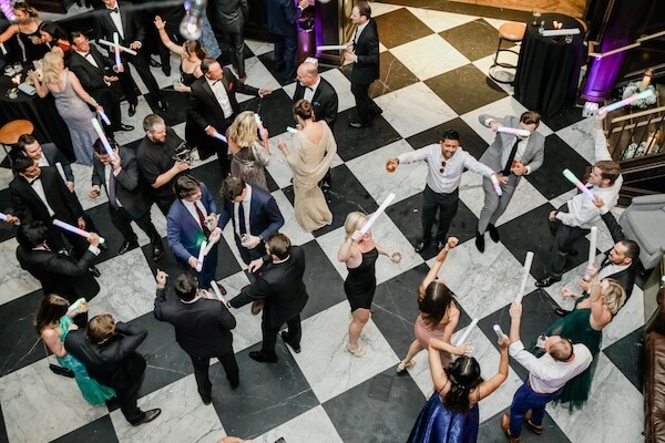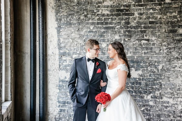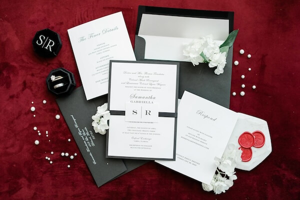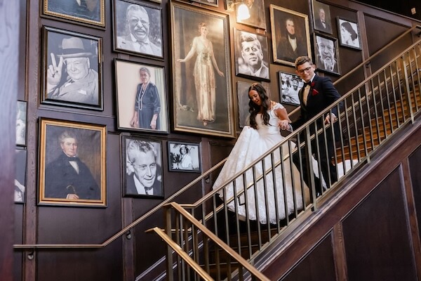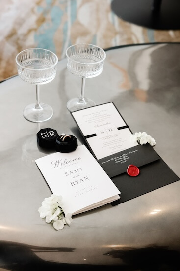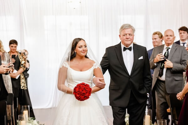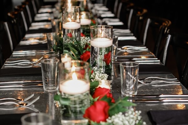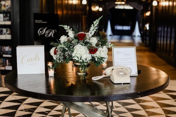 Inside, the dining room evoked old Hollywood Glam in black and white with subtle touches of red and gold. Long dining tables were draped in garlands of greenery. The tables were filled with dozens of floating candles, baby’s breath, and stunning red roses. This sleek and sophisticated look worked so well with the unique wedding venue.