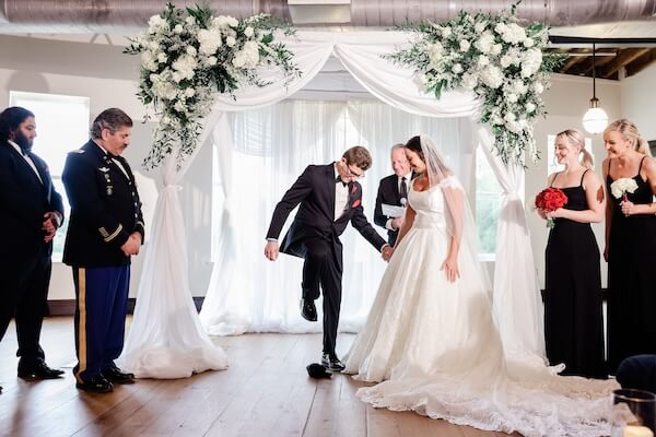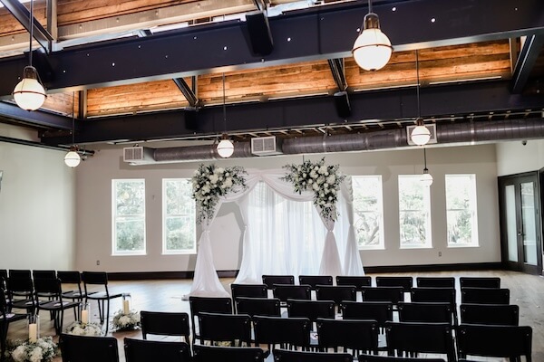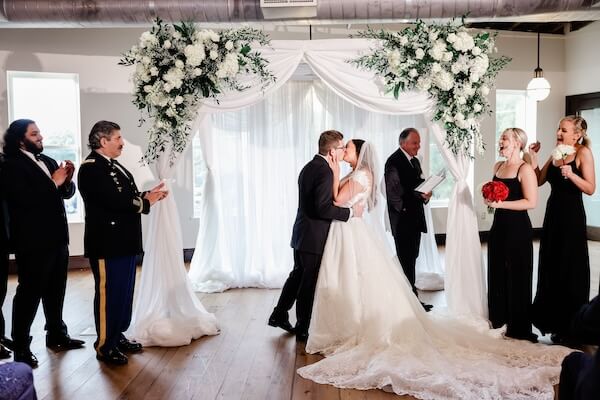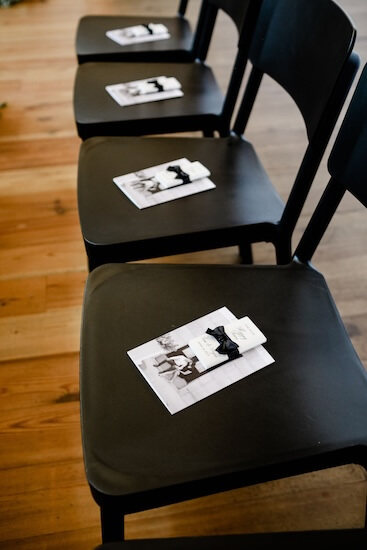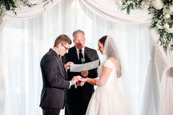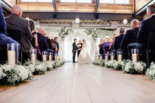 The ceremony space was set with a stunning Chuppah draped in white fabric and swags of beautiful white flowers. The aisle overflowed with arrangements of white flowers, baby’s breath, and large pillar candles. Sleek black chairs, each set with a wedding program and pack of tissues, filled the room. Before taking their seats for the wedding ceremony, guests enjoyed a glass of champagne.