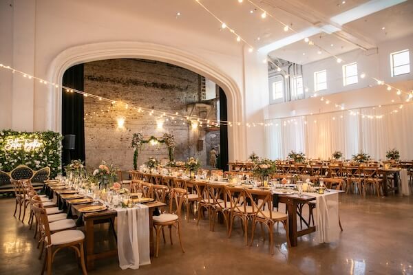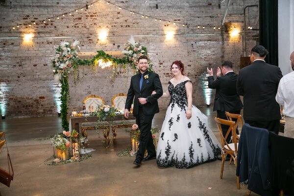 The couple’s ceremony was set against the beautiful backdrop of the whitewashed exposed brick wall. The wooden ceremony chairs and the gorgeous wedding structure with incredible flowers and candles were perfect.