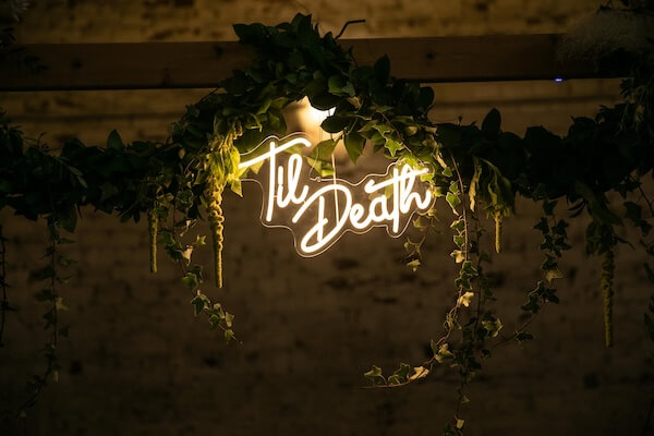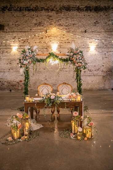 The couple’s sweetheart table was centered in the room. The luxurious ceremony structure and candles were repurposed to frame the rustic wood table. Over the sweetheart table, a fun neon sign read, “Til Death.”