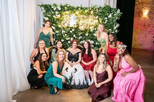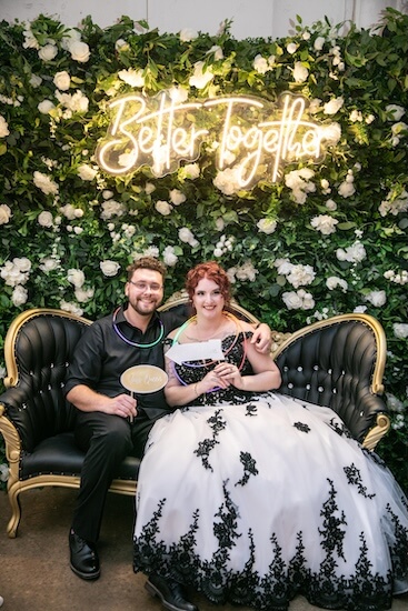 Off to one side of the room was a fun photo op featuring a black-and-gold couch in front of a floral wall and a neon sign reading “Better Together.”