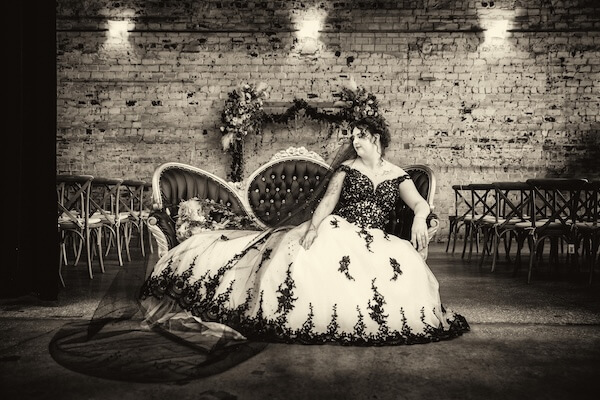 The couple’s wedding portraits in the area inside and surrounding the theatre were gorgeous. Usually, we only share couple’s portraits in this area, but this black-and-white photograph of Olivia is EVERYTHING!