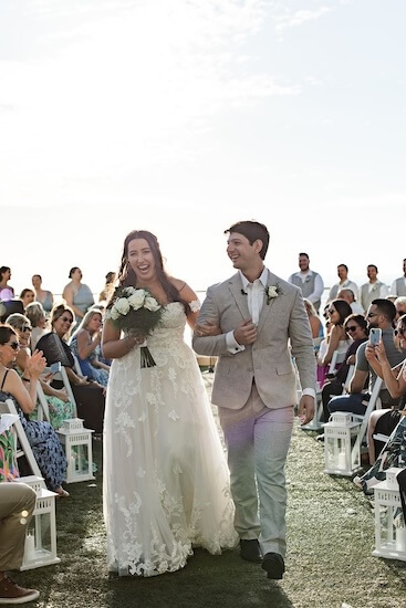 Arriving guests were greeted with a glass of champagne outside on the event lawn. They made their way down an aisle lined with lanterns overflowing with greenery and took their places overlooking the Gulf of Mexico.