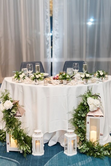 The couple’s sweetheart table reflected the same beach-inspired decor and was surrounded by the lanterns and flowers from their wedding ceremony. Off to one side was a simple, elegant, three-tiered white wedding cake with a custom cake topper.