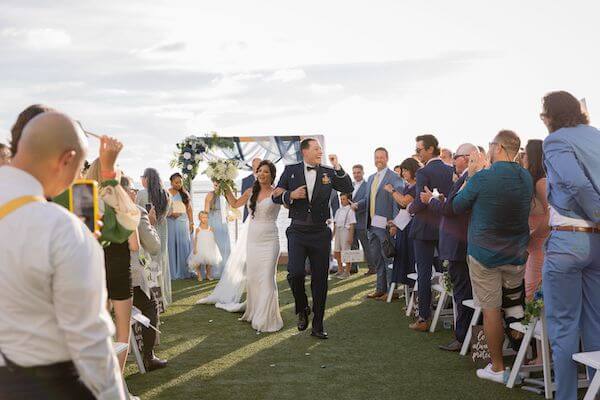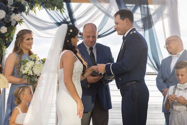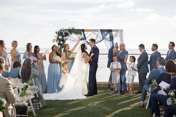 The two exchanged vows and rings, surrounded by family and friends with the glistening Gulf of Mexico as their backdrop.