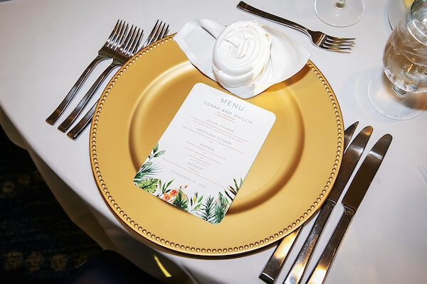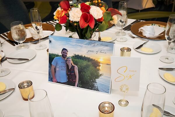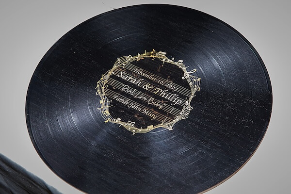 Inside the ballroom, a table held a vinyl record with the couple’s names, wedding date, and first dance song. Wedding guests were invited to write a message to the couple in silver or gold markers. It made a great remembrance of the day they could easily frame.