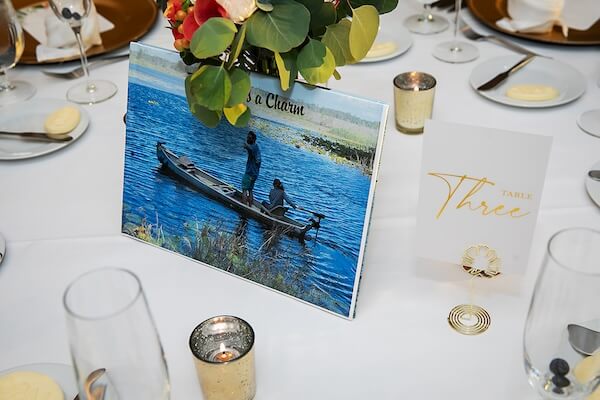 Tables were draped in crisp white linens, gold charge plates, a custom menu card, and a napkin in a delicate rose fold. Each table contained gold candles, table numbers, and fun photos of the bride and groom.