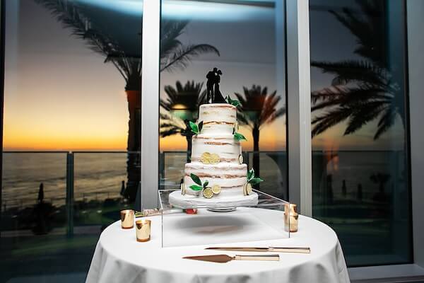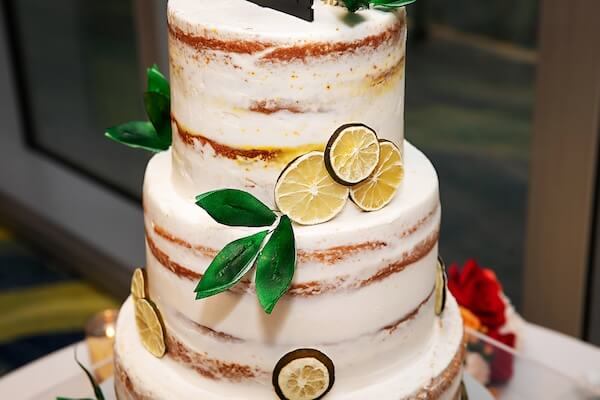 Off to one side of the couple’s sweetheart table was their delicious semi-naked wedding cake decorated with dehydrated citrus slices and a custom cake topper. The cake flavors included Tiramisu, Mango with Vanilla Buttercream, and Key Lime with Lemon Butter Cream.