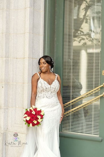The room was washed with natural light from the floor-to-ceiling windows. Gold chiavari ballroom chairs sat on either side of a crisp white aisle runner adorned with red rose petals.