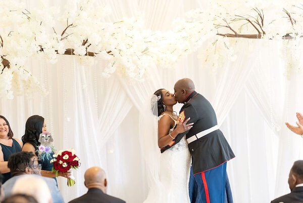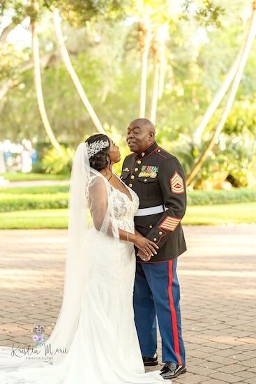 Serena and Gary’s Tampa Garden Club wedding in Navy, gold, and white with accents of red had all the feels! It had personal touches and fantastic family moments, and Serena looked stunning, and we loved Gary’s dress blue uniform.