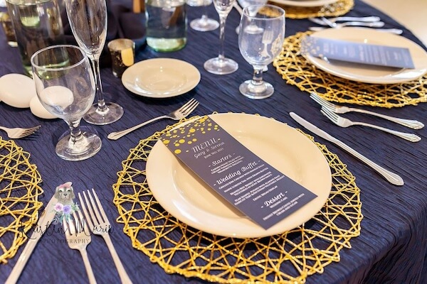 The look was completed with Navy blue napkins in chunky gold rings, custom menu cards, gold table numbers, and votive candles.