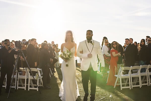 The couple exchanged wedding rings and vows surrounded by family and friends, sealing their vows with a kiss, then made their exit to “A Sky Full Of Stars!”
