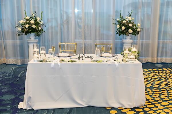 Inside the resort’s ballroom, everything was in place for a special evening. Tables draped in crisp white linen and gold chivari chairs surrounded an oversized white dance floor.