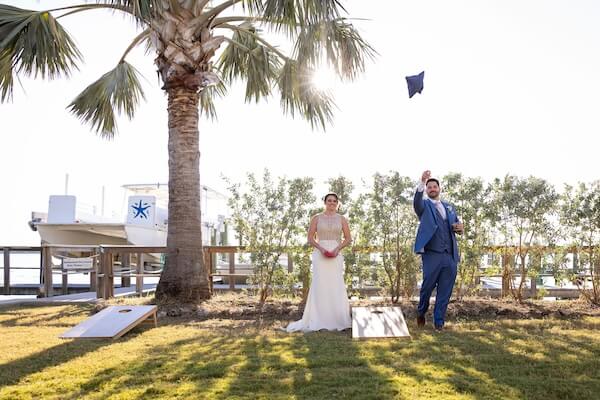 Meanwhile, it was time for the couple to head off for some fun and fabulous wedding portraits. They even snuck in a few rounds of corn hole before redoing their guests.