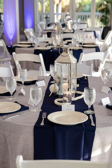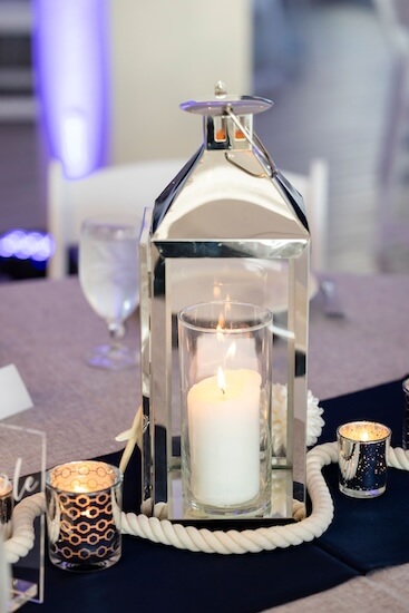Inside the ballroom, under a canopy of soft drapery, tables were dressed in grey burlap cloth with navy blue runners, silver lanterns, braided rope, and candles.