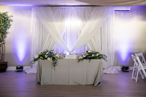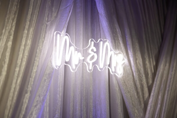 The newlywed’s sweetheart table sat in front of a beautiful backdrop of flowing drapery with Mr. And Mrs. In neon lights. The table included a box containing champagne dated ten years earlier.