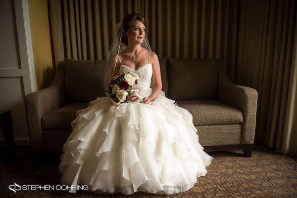 The sun set as everyone was invited inside to the Harbor Ballroom. The tables, draped in soft white linen and dressed with centerpieces of white hydrangea and red roses were surrounded by floating and gold votive candles. Fun light blue beer koozies with Dotti and Lance’s names and wedding date sat at each place setting.