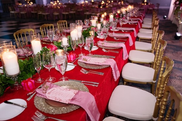 And last, but certainly not least, were A Chair Affair’s Gold Filigree Glass Charger plates. The gold charger popped against both the raspberry satin linens on the guest tables and the stunning red velvet linens on the head table.