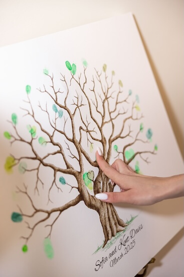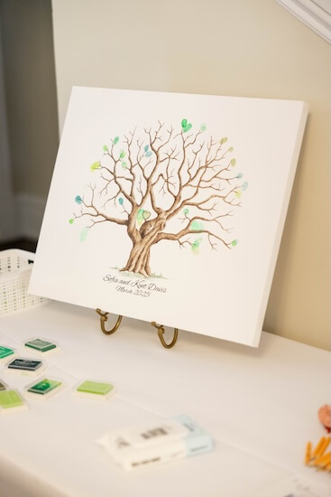 Additionally, the couple crafted a beautiful thumbprint tree guest book where family and friends could create leaves with their thumbprints and various colors of ink.