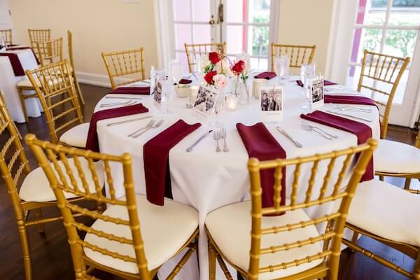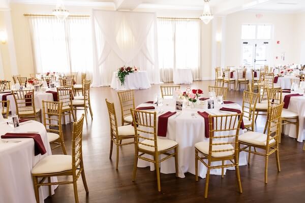 Inside the ballroom, tables were draped with crisp white linens, burgundy colored napkins paired perfectly with the floral arrangements in shades of pink and burgundy. Gold chivari chairs made the whole room pop!
