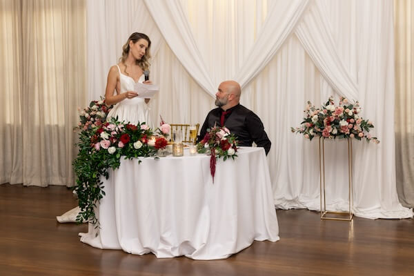 Off to one side was the couple’s Sweetheart table with a beautiful cascade of flowers. The incredible fabric drape framed the table perfectly.