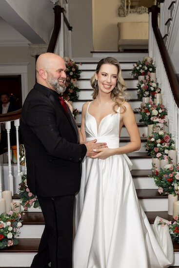 Entering the mansion, the stairs are a beautiful focal point, and they were dressed for the occasion with candles and flowers.